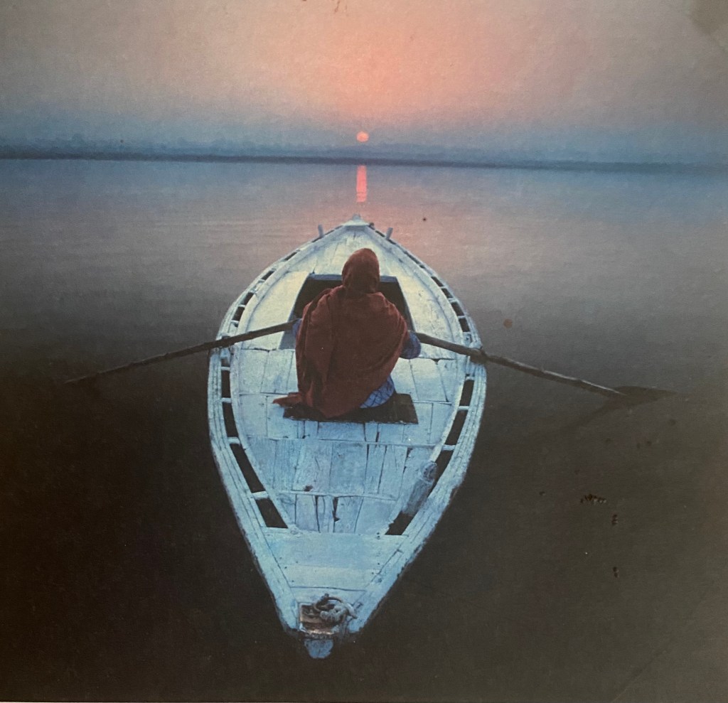 We see an image of a person wearing a dark red cloak and hood, with their back to us, rowing a white rowing boat across a still expanse of water towards a setting sun.