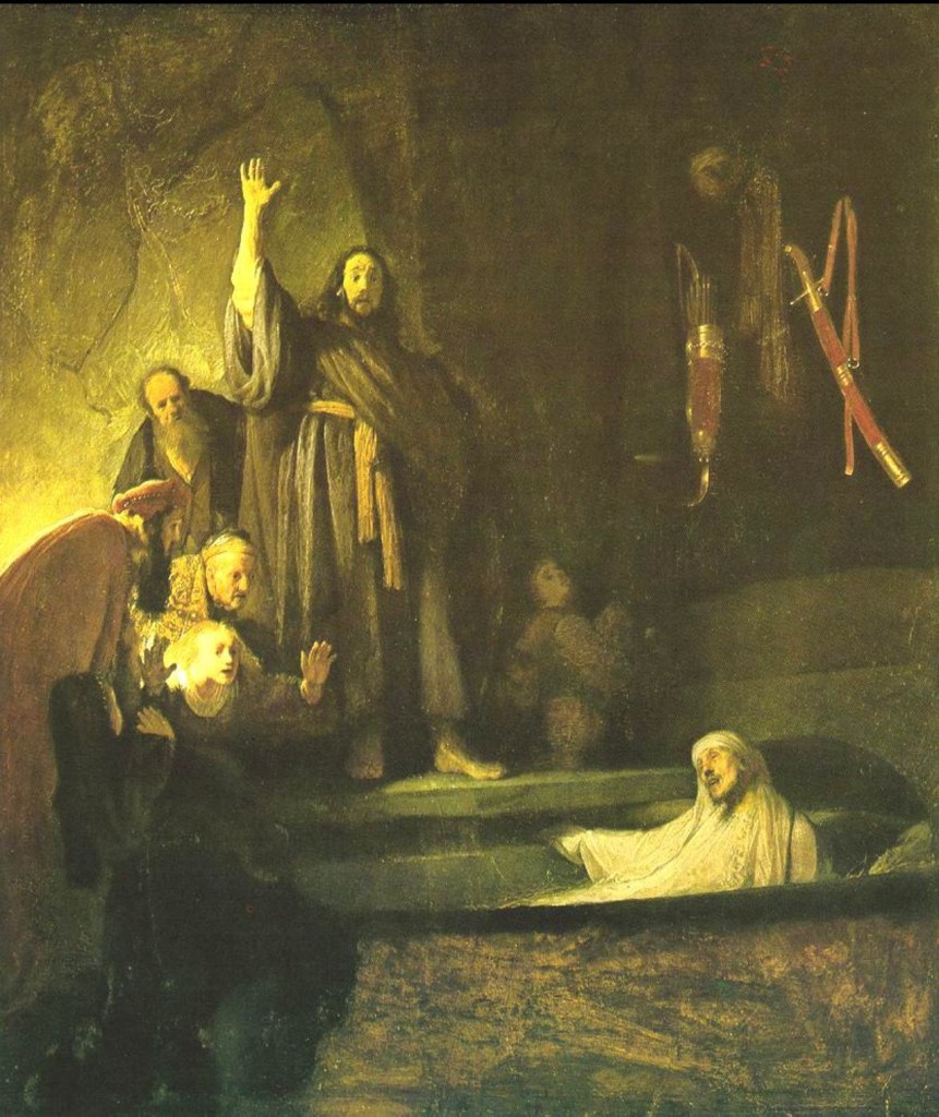 We see a painting of the Raising of Lazarus by Rembrandt. Jesus is shown standing above a tomb from which Lazarus is emerging. Jesus’ right hand is raised, and His mouth is open. Lazarus’ two sisters and others look on.