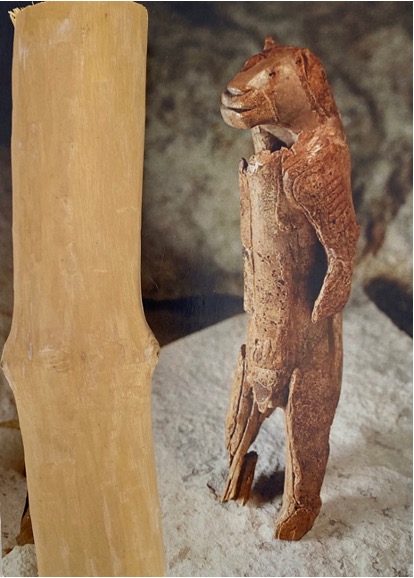 Some years ago there was an exhibition at the British Museum of ‘Ice Age Art’ and I was fascinated by a carving, made from a piece of mammoth tusk, of a figure of a lion man, with the head of a cave lion and the body of a man. In 1939 it had been found in fragments at the back of a north facing cave in what is now southern Germany. The war intervened and the fragments were stored away in a box and forgotten until some years later. When re-discovered it was found that they fitted together to make this carved figure of a lion man, which was reckoned to be about 40,000 years old Nobody now knows what purpose the figure served, but the assumption is that it may have served a ritual purpose.