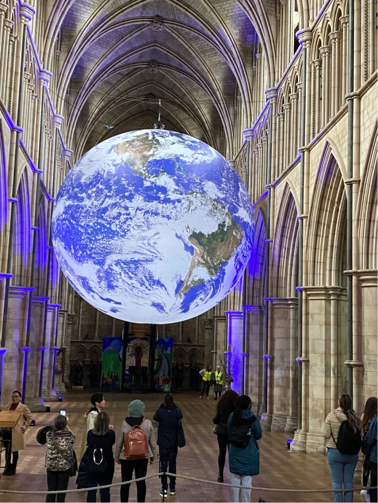 Intrigued I went along and was taken aback by the sight of a huge revolving model of our Earth, hung suspended in the Nave of the Cathedral. Many people were present, of all ages & nationalities, walking round, or standing and gazing wrapped in wonder at what they were seeing. There was a still & prayerful atmosphere. I went & stood in the Chancel and looked down the length of the building.