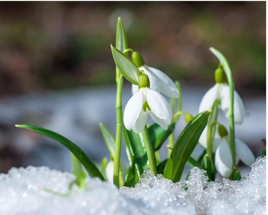 We see a photograph of some Snowdrops pushing up out of a covering of snow.